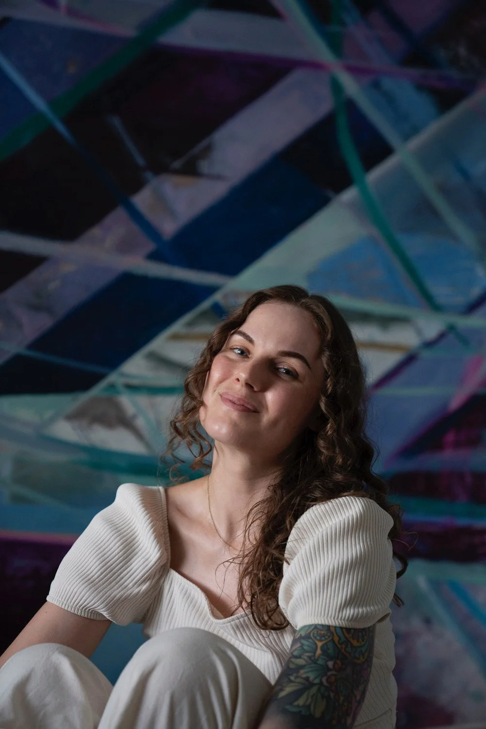 Tapping into her love of movement, texture and colour she creates large, unplanned abstract works of art. She is inspired by Precisionism, Cubism and the plethora of incredible artists she knows from the animation industry as well as artists from the contemporary art scene.